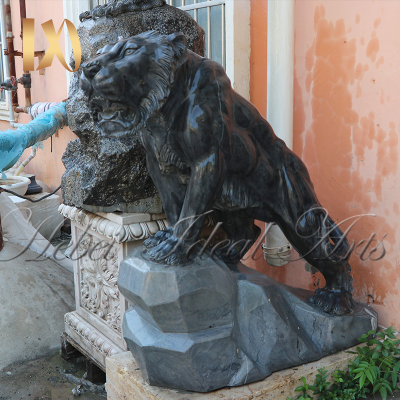 The tiger's body is majestic, strong and tall, with beautiful fur, a round head, wide kisses, big eyes, and a white beard with a black beard on the side of the mouth, which is about 15 cm long. The neck is thick and short, almost as wide as the shoulders. The shoulders, chest, abdomen, and buttocks are narrow, flat on the sides, strong limbs, extremely sharp canine teeth and claws, and long, hard whiskers on the mouth. The tiger in the statue has four strong legs. Its claws are pointed, and its eyes are wide open. There are some beards around its mouth, and its big teeth are like a knife. Its strong, thick limbs and pair of piercing eyes make it look majestic. This beautiful statue depicts a fierce tiger, overlooking the scene below the perch on the windowsill. This amazing work is hand-carved from amazing marble, making the sculpture look even more magnificent.